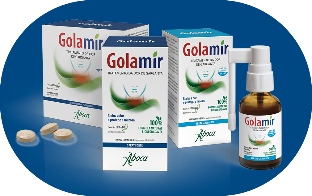 Golamir é uma linha de produtos 100% naturais e biodegradáveis indicada nos casos de dor de garganta para o tratamento dos estados irritativos e inflamatórios da cavidade orofaríngea, que podem ser causados por vírus, bactérias, alergénios ou pelo contacto com agentes externos irritantes (fumo, poluição, pó).